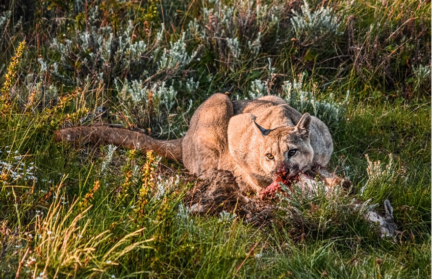 Como un guanaco proporciona más carne de la que un felino solitario puede comer de una vez, los pumas esconden los restos con cuidado. Regresan durante días a menos que los carroñeros, zorros culpeo, caranchos y cóndores lleguen primero al cadáver. Estas comidas inesperadas se propagan por la red alimentaria, sustentando desde escarabajos hasta aves rapaces.
